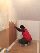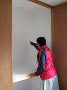 ■布団や座布団類をしまう収納がジメジメしてカビ臭くなってしまう。とのお話を伺い、ガイナ(ノン結露タイプ)をご提案、ご採用いただきました。この塗料はガイナの性能の中の防湿に特化したもので、塗った表面が結露しません。収納内部に塗った場合には、布団などが湿らずカビの発生を抑えることが出来ます。